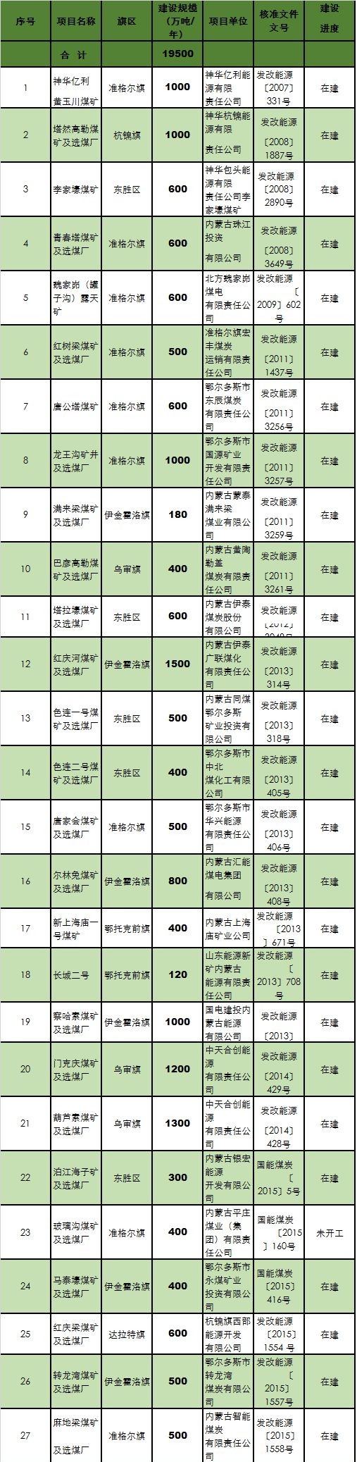 鄂尔多斯市将续建26座煤矿,产能17100万吨(附名单)