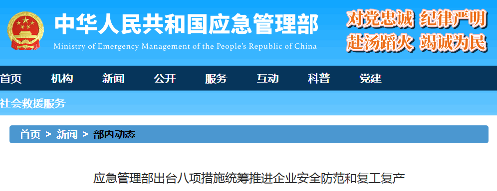 2月26日,应急管理部制定出台统筹推进企业安全防范和复工复产八项措施,强化安全风险研判,创新安全监管方式,牢牢守住安全底线,指导帮助解决实际困难,支持各类企业复工复产。