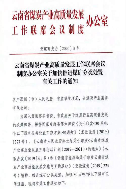 2月28日,云南省煤炭产业高质量发展工作联席会议制度办公室发布《关于加快推进煤矿分类处置有关工作的通知》。