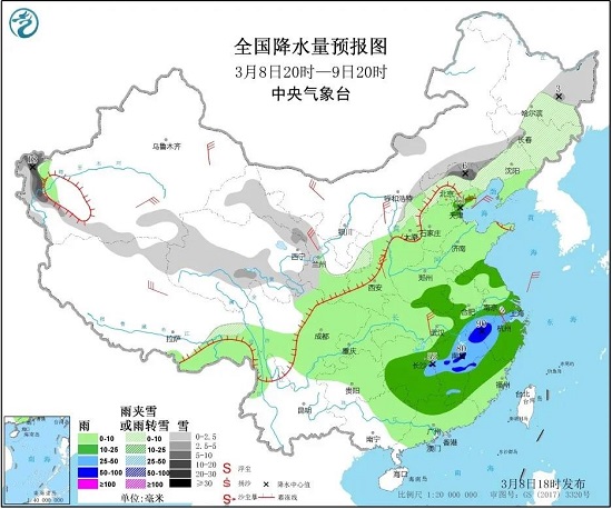 1、今日天气:东北地区、内蒙古、华北、甘肃、青海、新疆等地部分地区有小到中雪或雨夹雪,局地有大雪或暴雪。黄淮、江淮、江汉、江南、华南等地部分地区有中到大雨,局地有暴雨。