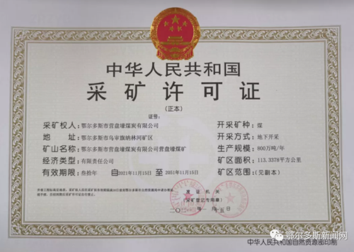 鄂尔多斯市自然资源局消息,11月15日,经内蒙古自治区自然资源厅审核同意,鄂尔多斯市自然资源局为鄂尔多斯市营盘壕煤炭有限公司营盘壕煤矿颁发了采矿许可证,实现了营盘壕煤矿合法化生产。