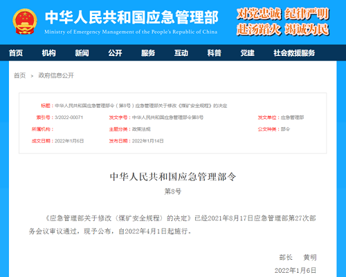 1、《应急管理部关于修改〈煤矿安全规程〉的决定》发布。作相应修改后也重新进行了公布,自2022年4月1日起施行。