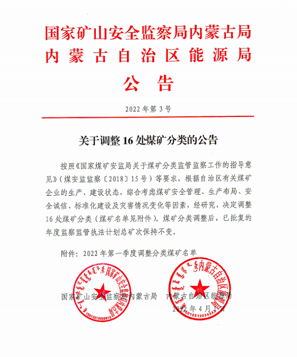 近日,国家矿山安全监察局内蒙古局内蒙古自治区能源局关于调整16处煤矿分类的公告。