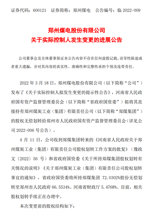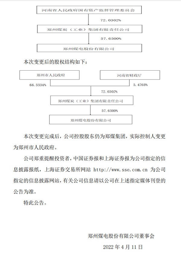 本次变更完成后,郑州煤电控股股东仍为郑煤集团,实际控制人将变更为郑州市人民政府。