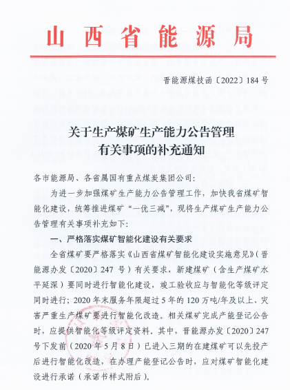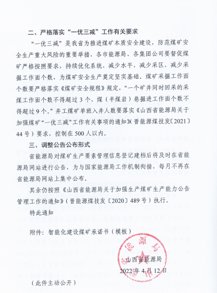 为进一步加强煤可矿生产能力公告管理工作,加快山西省煤矿智能化建设,统筹推进煤矿“一优三减”,现将生产煤矿生产能力公告管理有关事项补充如下: