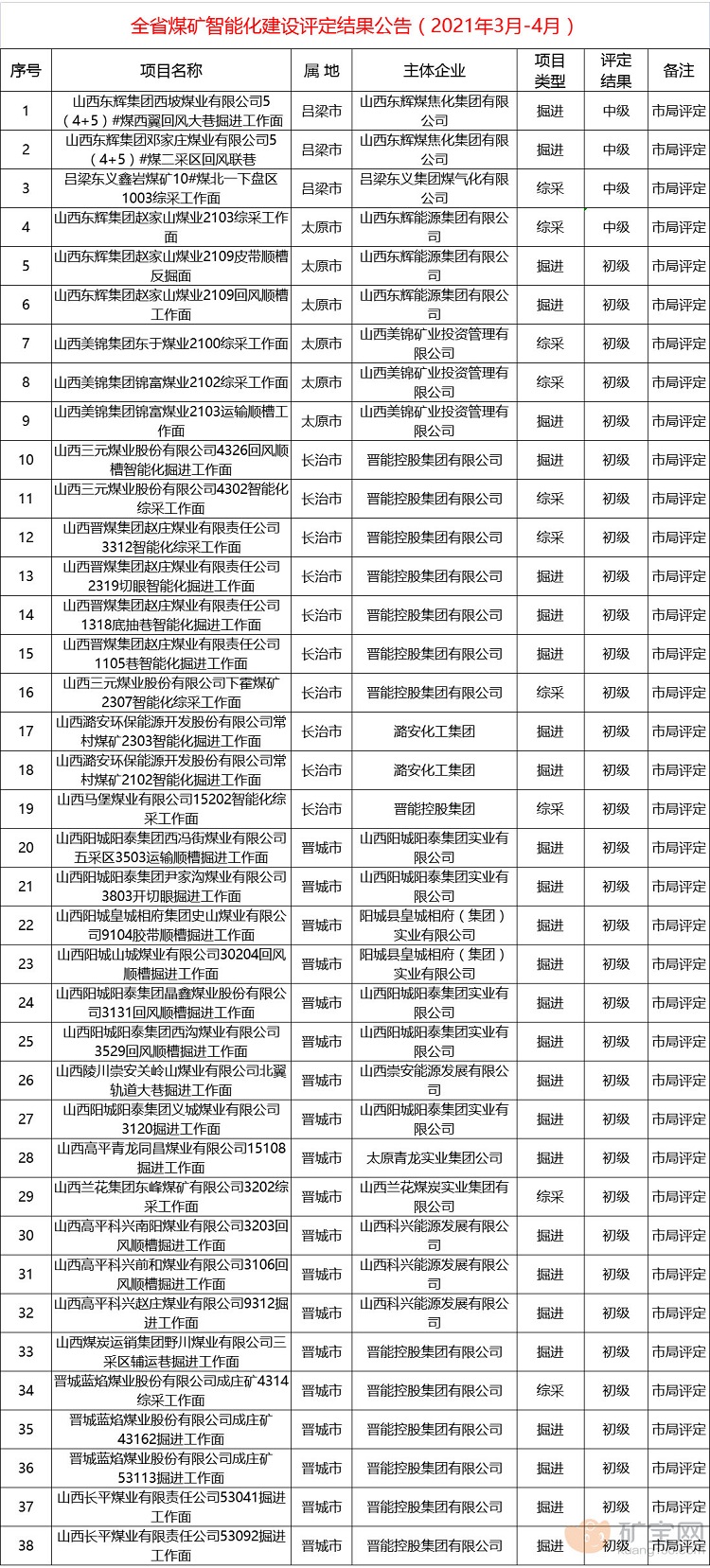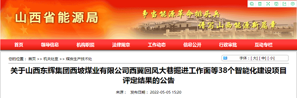 经吕梁市、太原市等能源局按文件规定对山西东辉集团西坡煤业有限公司西翼回风大巷掘进工作面等38个煤矿智能化建设项目进行了现场评定,现将符合《全省煤矿智能化建设基本要求及评分方法(试行)》的智能化项目予以公告。