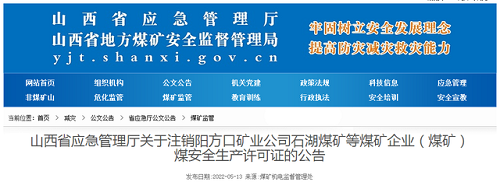 5、5月13日,山西省应急管理厅发布《关于注销阳方口矿业公司石湖煤矿等煤矿企业(煤矿)煤安全生产许可证的公告》。