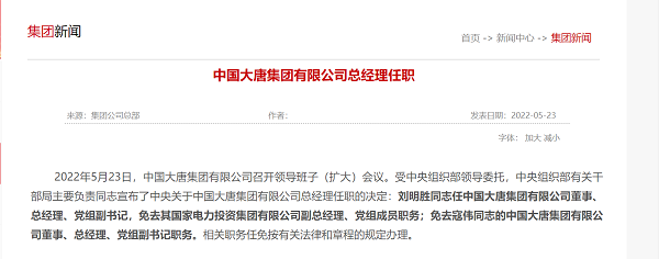 2022年5月23日中国大唐集团有限公司召开领导班子(扩大)会议。受中央组织部领导委托,中央组织部有关干部局主要负责同志宣布了中央关于中国大唐集团有限公司总经理任职的决定: