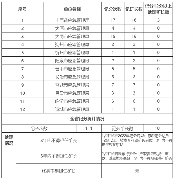 山西省煤矿矿长安全生产考核记分工作情况表(从2022年1月1日至2022年5月31日)