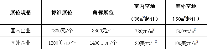 注:a. 标准展位提供:三面围板、楣板制作、洽谈桌一张、折椅两把、射灯两只、10A插座一个。