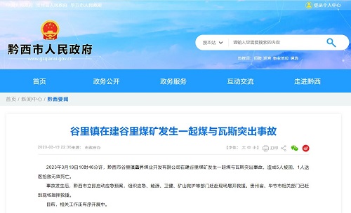 2、2023年3月19日10时46分许,黔西市谷里镇鑫昇煤业开发有限公司在建谷里煤矿发生一起煤与瓦斯突出事故,造成5人被困,1人送医抢救无效死亡。