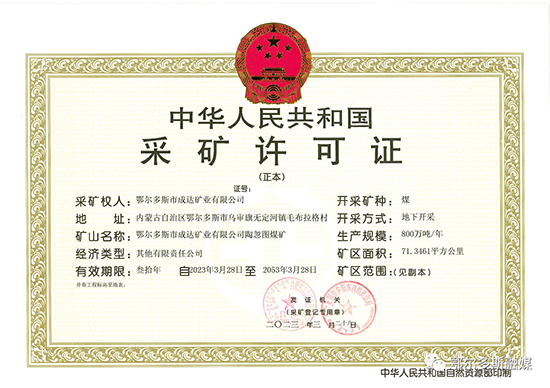 3月28日,内蒙古自治区自然资源厅、鄂尔多斯市自然资源局向鄂尔多斯市成达矿业有限公司颁发了陶忽图煤矿采矿许可证。