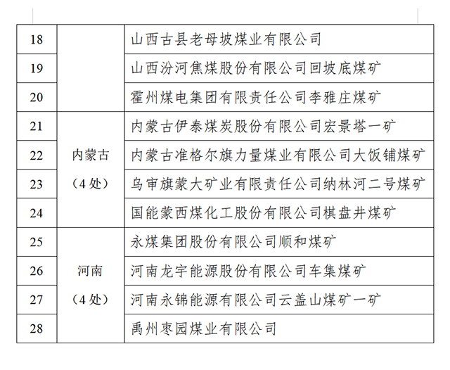按照《煤矿安全生产标准化管理体系考核定级办法(试行)》和《煤矿安全生产标准化管理体系基本要求及评分方法(试行)》(煤安监行管〔2020〕16号)的有关规定,经资料审查和现场检查考核,现有28处煤矿达到安全生产标准化管理体系一级标准,现予以公示,接受社会监督。公示期间,如发现申报煤矿存在瞒报事故、弄虚作假等违法违规行为的,将依规定取消其申报资格。