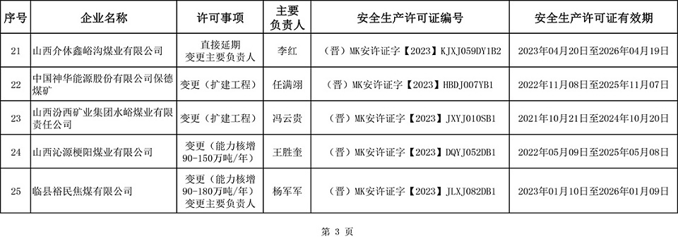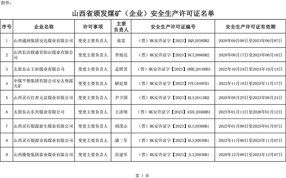 根据有关规定,经2023 年3 月31 日煤矿安全生产许可事项联席会议研究决定,为山西通洲集团安达煤业有限公司等 25 座煤矿(企业)颁发安全生产许可证,现进行公告。