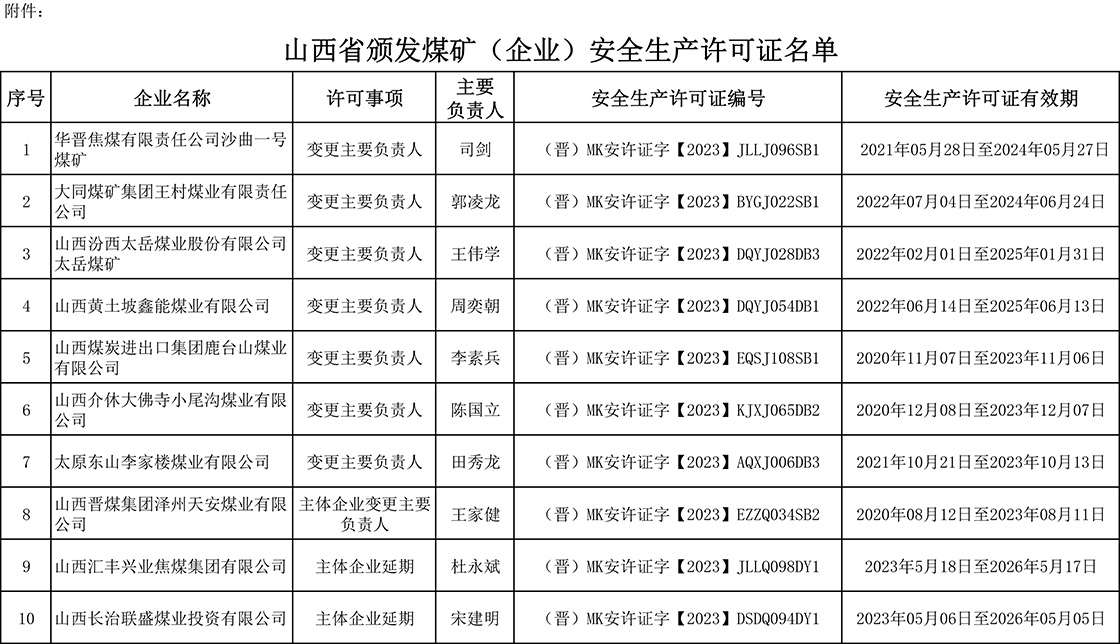 山西省应急管理厅关于颁发 煤矿(企业)安全生产许可证的公告 根据有关规定,经 2023 年 4 月 14 日煤矿安全生 产许可事项联席会议研究决定,为华晋焦煤有限责任 公司沙曲一号煤矿等 18 座煤矿(企业)颁发安全生产 许可证,现进行公告。