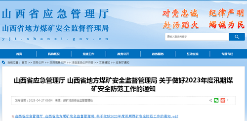 8、日前,省应急管理厅下发《关于做好2023年度汛期煤矿安全防范工作的通知》,要求各级煤矿安全监管部门、各煤矿企业立足防大汛、抗大险、救大灾,以“时时放心不下”的责任感,切实强化汛期煤矿安全防范工作措施,坚决遏制煤矿生产安全事故发生。