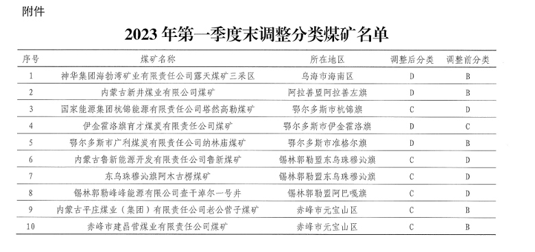 国家矿山安全监察局内蒙古局公布2023年第一季度末调整分类煤矿名单。