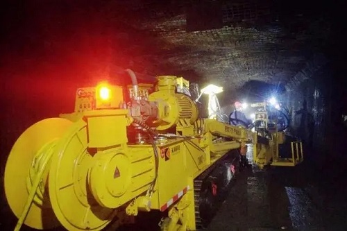 5、近日,朱家峁煤矿首次在井下1308回撤通道应用防爆履带锚机钻车,该设备有效解决了井下巷道补强支护作业地点分布零散、工作量大和效率低等问题。