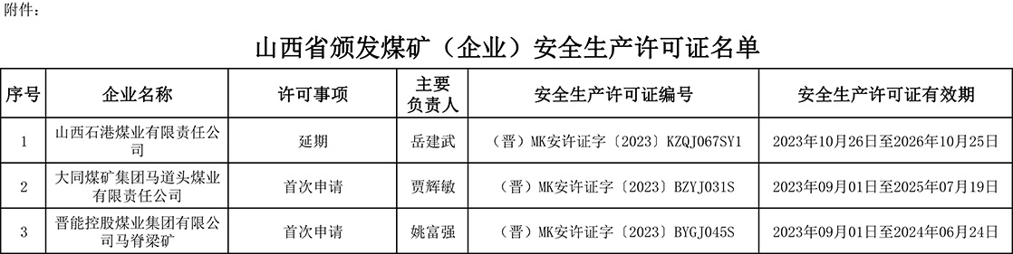 经研究,按照有关规定,为山西石港煤业有限责任公司等 3 座煤矿(企业)颁发安全生产许可证,现进行公告。