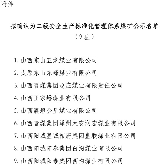 按照国家矿山安监局《煤矿安全生产标准化管理体系考核定级办法(试行)》和《煤矿安全生产标准化管理体系基本要求及评分方法(试行)》有关规定,在企业申报、市局初审的基础上,经资料审查和现场检查,拟确认山西东山五龙煤业有限公司等 9 座煤矿为二级安全生产标准化管理体系煤矿,现予公示,接受社会监督。