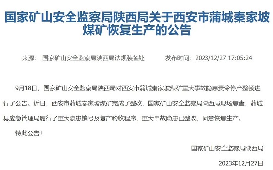 12月27日, 国家矿山安全监察局陕西局发布两项公告,分别同意韩城市后洞沟煤矿、西安市蒲城秦家坡煤矿恢复生产。