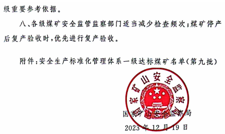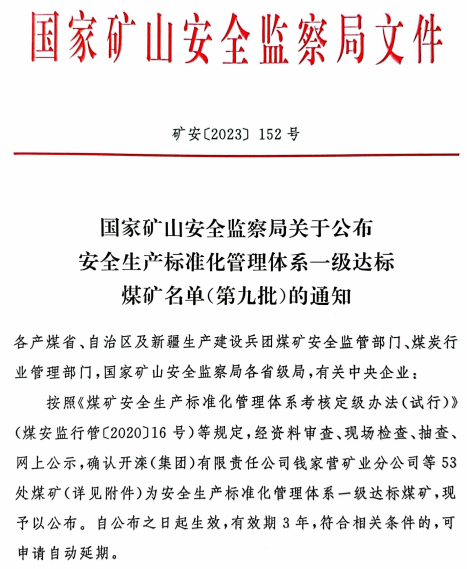 现将国家矿山安全监察局《关于公布安全生产标准化管理体系一级达标煤矿名单(第九批)的通知》(矿安〔2023〕152号)转发你们。公布名单中我省的 17 座煤矿,是国家第九批确认的安全生产标准化管理体系一级达标煤矿,是我省开展煤矿安全生产标准化管理体系达标创建工作中涌现出的先进典型。