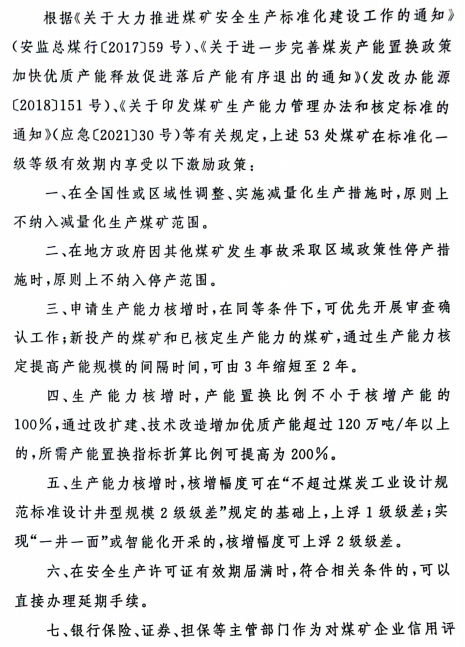 一、希望这 17 座一级安全生产标准化管理体系煤矿,持续改进和完善安全生产条件,进一步加强安全、生产、技术和现场管理,定期开展安全生产标准化管理体系达标自检,实现持续达标、动态达标,保障安全生产。