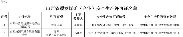 经研究,按照有关规定,为山西长治经坊庄子河煤业有限公司等 2 座煤矿(企业)颁发安全生产许可证,现进行公告。